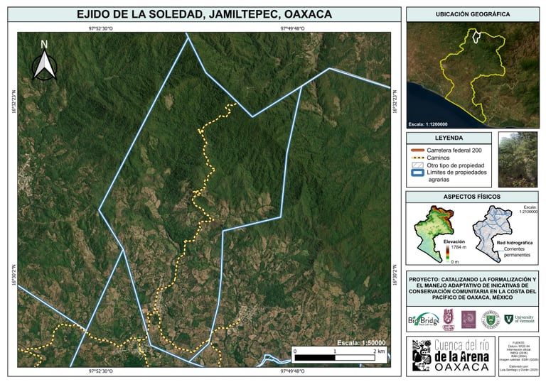 El Área de Conservación "La Soledad", ubicada en San Juan Colorado, Oaxaca, constituye un bastión de selva mediana subcaducifolia con comunidades de corozales. Se ubica en el parteaguas norte de la cuenca del Río de la Arena, funcionando como un regulador hídrico vital para la región. Este territorio es el refugio de fauna emblemática que incluye felinos como el tigrillo y el yaguarundi, además de poblaciones de jabalíes, cuya presencia es un indicador de la salud del ecosistema que la comunidad se ha esforzado en preservar.